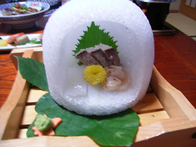 器っていうか実際に氷で作られたミニかまくらにお刺身がのっているのです。