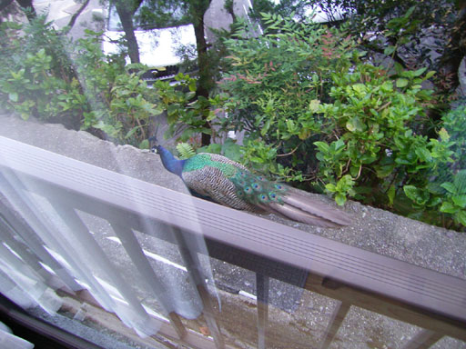 窓の下って駐車場なんですけど・・・。孔雀ってこういうところに生息しているのかしら・・・。