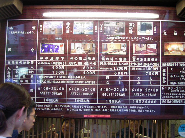 入浴のみと、お茶、せんべい、団子付きとか個室付きとか・・・。